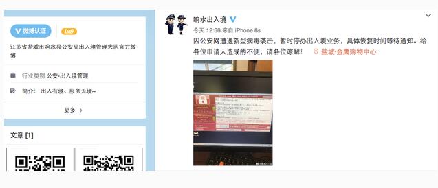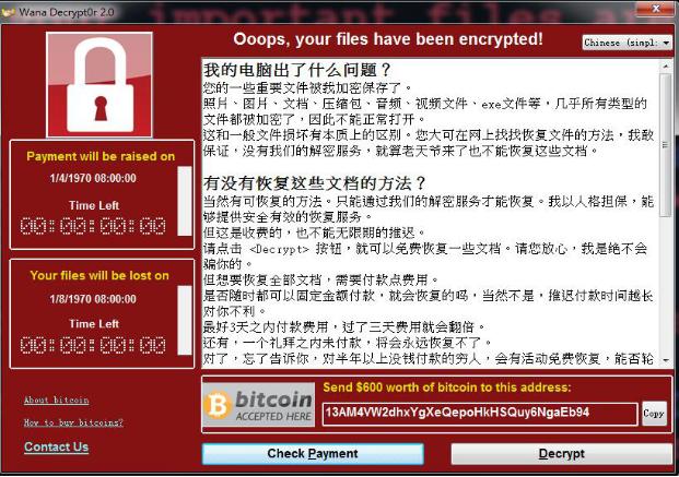 由于一帶一路高峰論壇明天在北京召開,這是今年中國最大的外交事件,29個國家的國家元首或政府首腦以及來自130多個國家的1500名代表將出席。恰在此時,基于SMB文件共享傳播的蠕蟲病毒攻擊開始了大規模傳播,512日晚上20時左右,全球爆發大規模勒索軟件感染事件,用戶只要開機上網就可被攻擊。五個小時內,包括英國、俄羅斯、整個歐洲以及國內多個高校校內網、大型企業內網和政府機構專網中招,被勒索支付高額贖金(有的需要比特幣)才能解密恢復文件,這場攻擊甚至造成了教學系統癱瘓,包括校園一卡通系統。